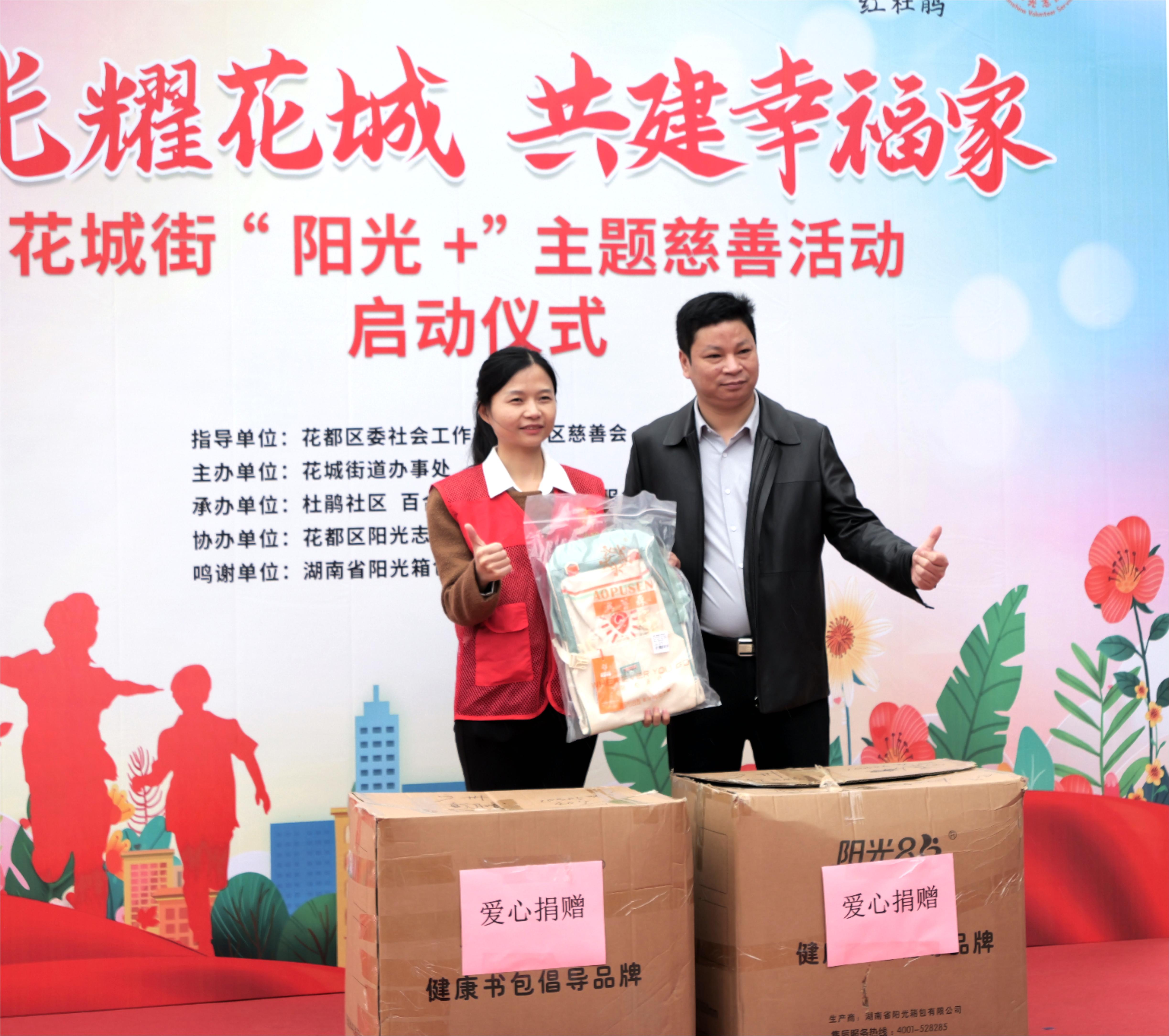 2025年3月29日,花都區花城街“陽光 +”主題慈善活動啟動儀式在杜鵑社區黨群服務中心盛大舉行,打造“陽光+”黨建引領共建共治新風尚。陽光箱包集團作為陽光公益合伙人積極參與其中,與眾多愛心人士齊聚一堂,共赴這場愛心之約。