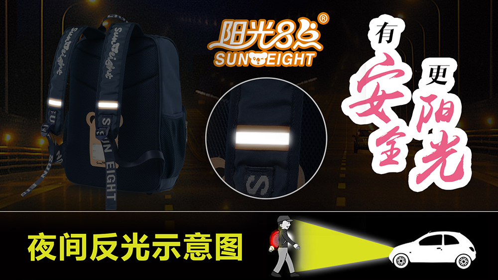 陽光8點書包多處設有智能安全反光條能在夜間或黑暗的環境中提高可見度能讓孩子在夜間行駛活動更加安全多一份保障,多一份安心!